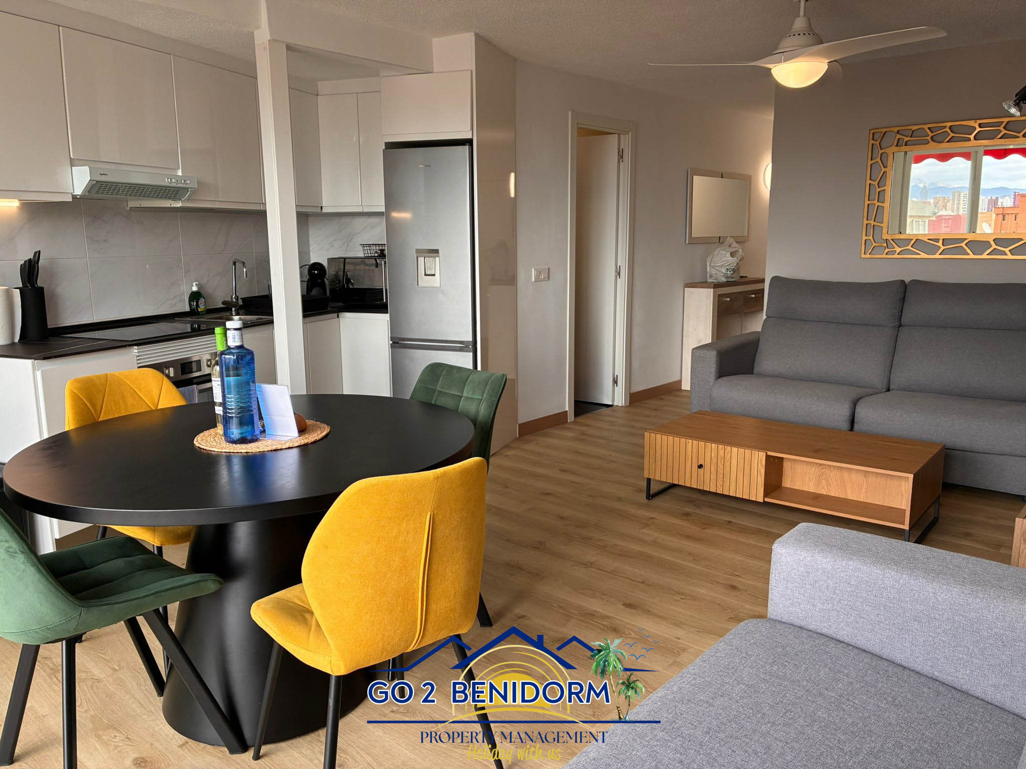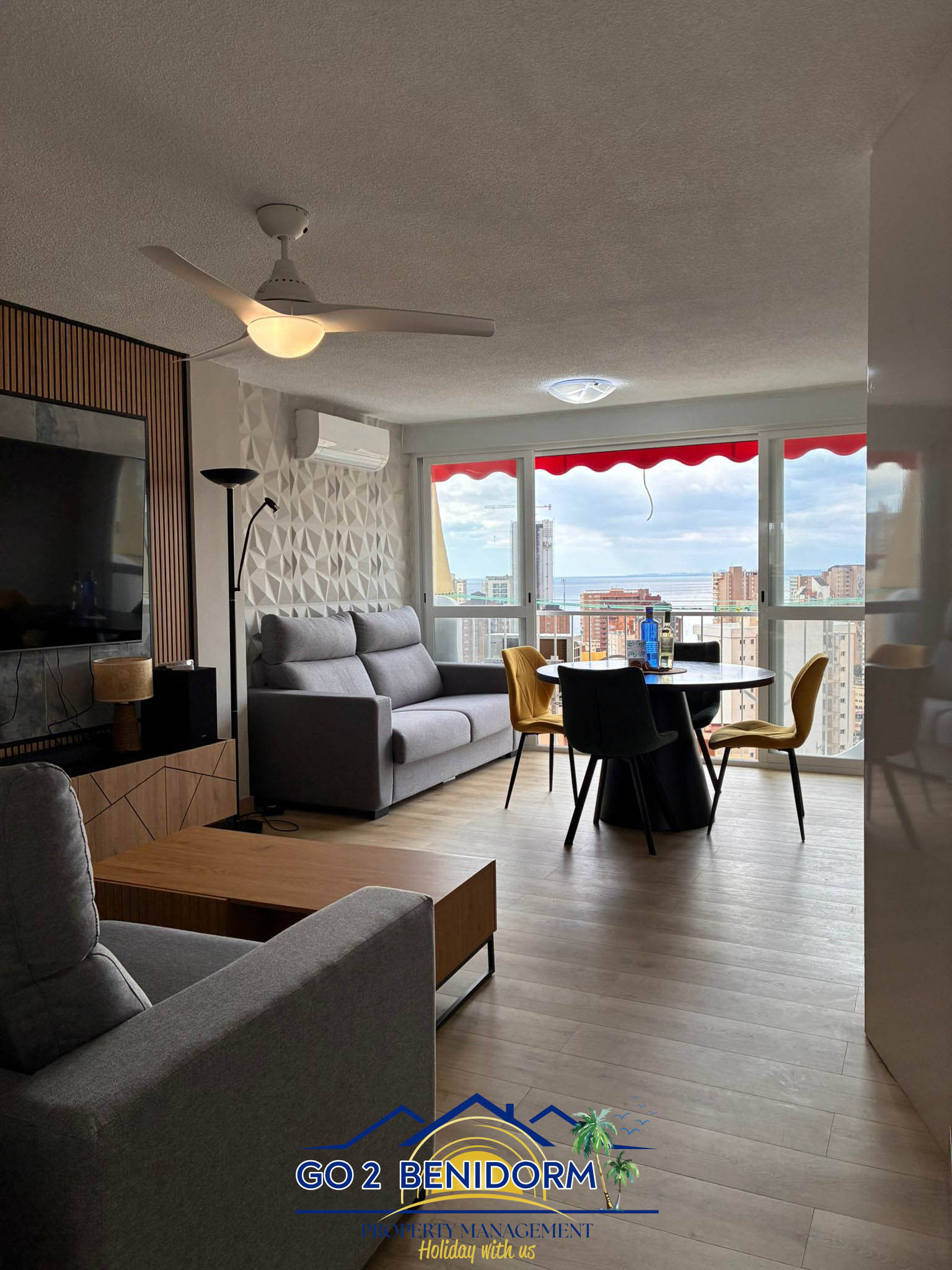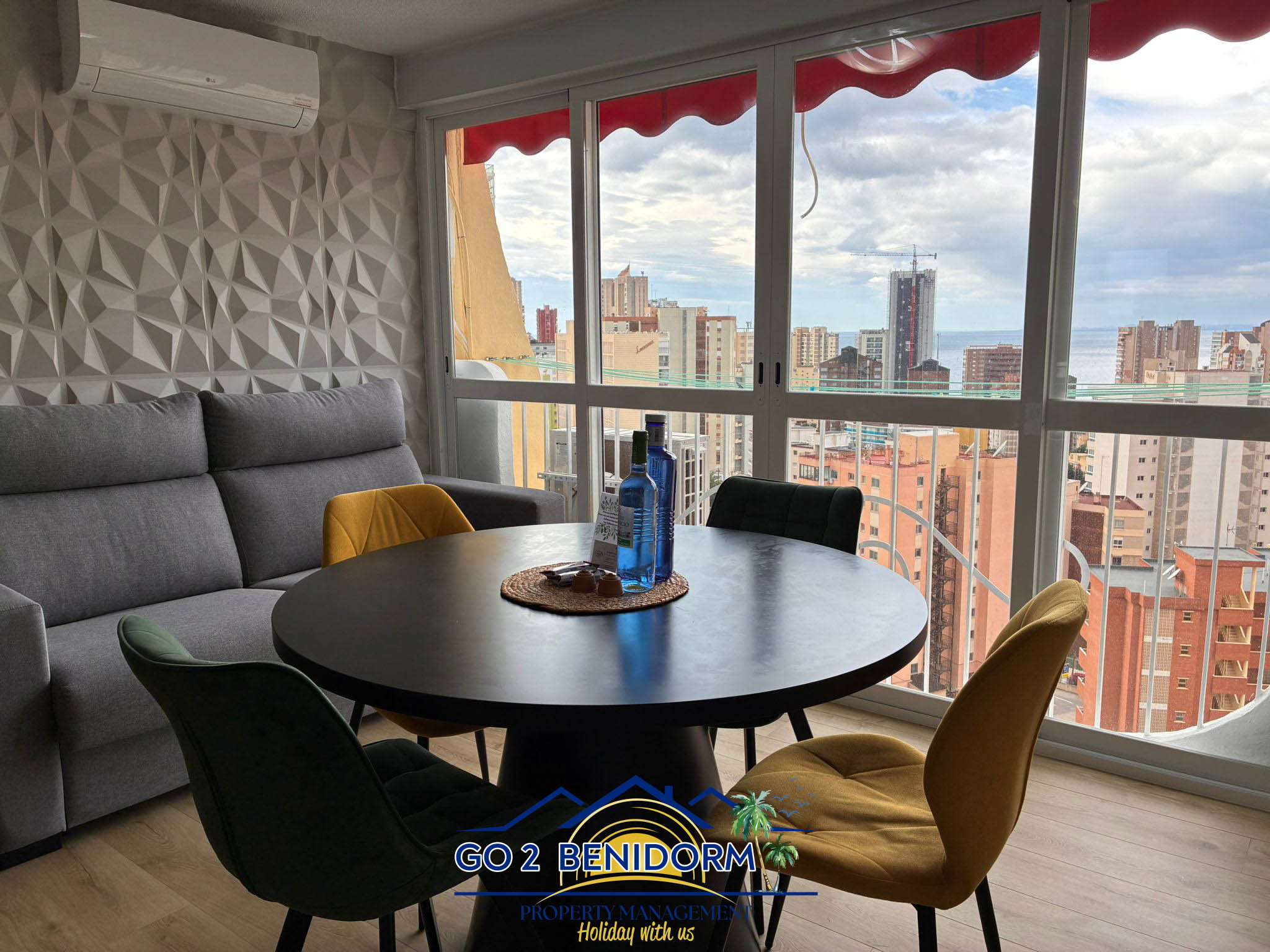 Una de las características más especiales del apartamento es la zona de comedor panorámica, que ofrece impresionantes vistas del horizonte de Benidorm y el mar infinito. Ya sea que estés disfrutando de un café matutino o una copa de vino al atardecer, la vista siempre te encantará.