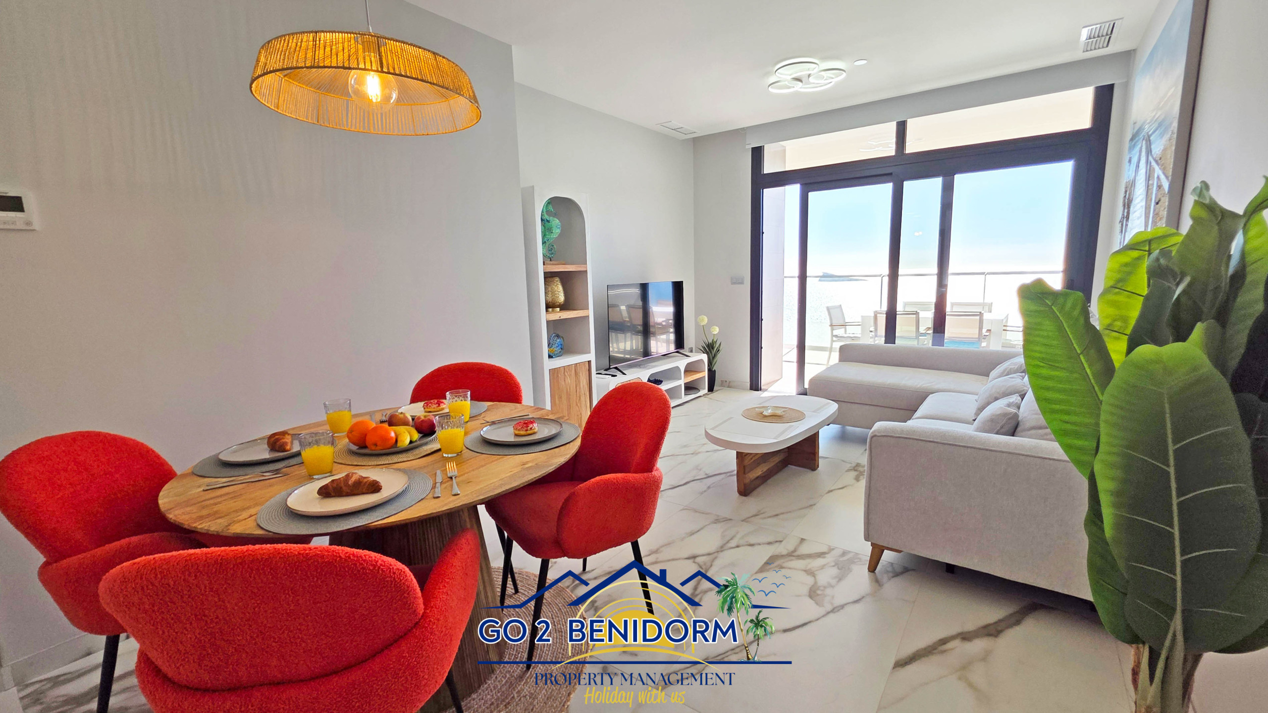 Una de las características más especiales del apartamento es la zona de comedor panorámica, que ofrece impresionantes vistas del horizonte de Benidorm y el mar infinito. Ya sea que estés disfrutando de un café matutino o una copa de vino al atardecer, la vista siempre te encantará.