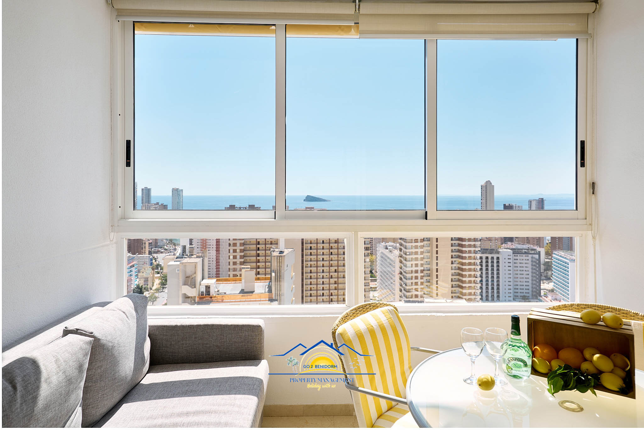 Una de las características más especiales del apartamento es la zona de comedor panorámica, que ofrece impresionantes vistas del horizonte de Benidorm y el mar infinito. Ya sea que estés disfrutando de un café matutino o una copa de vino al atardecer, la vista siempre te encantará.
