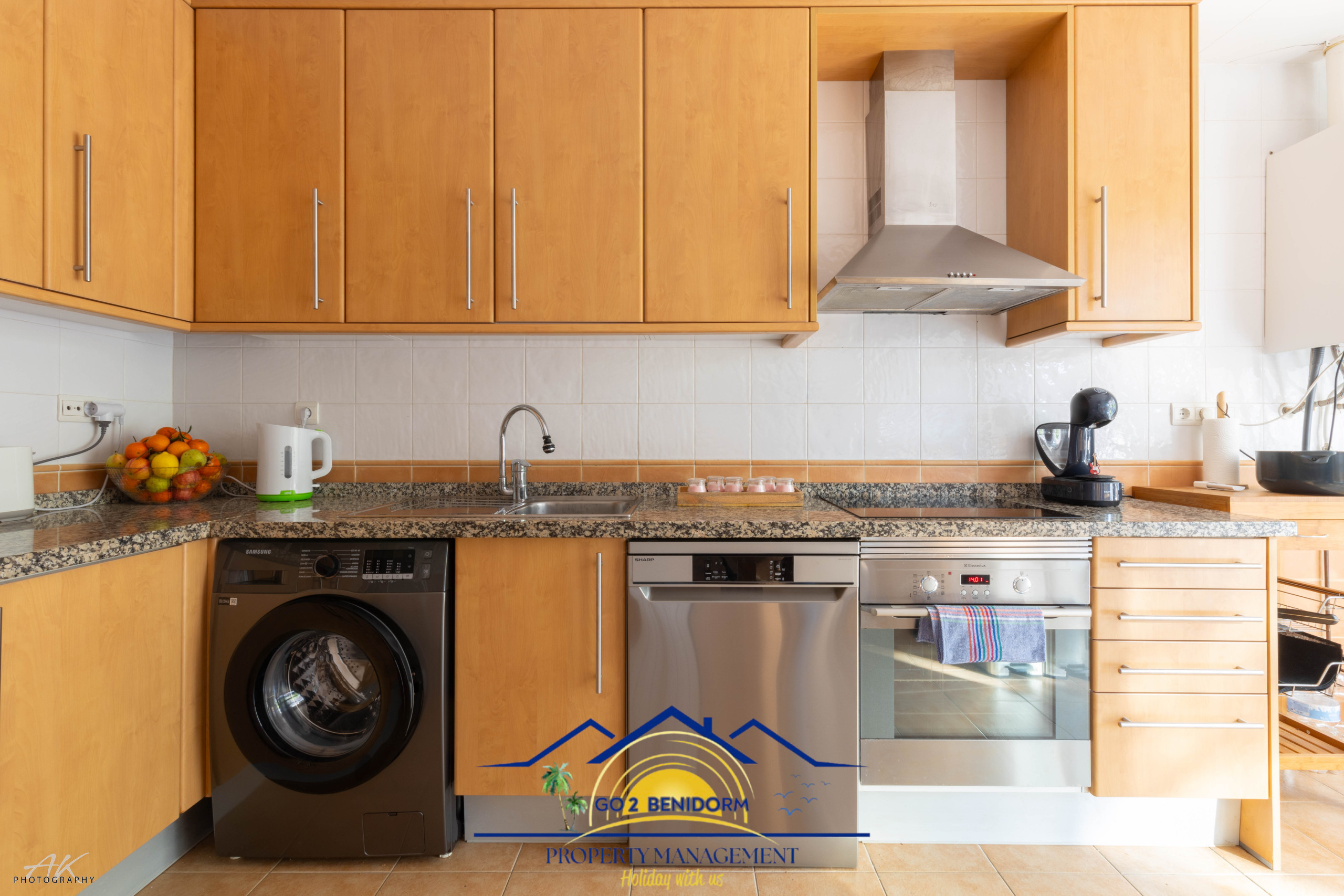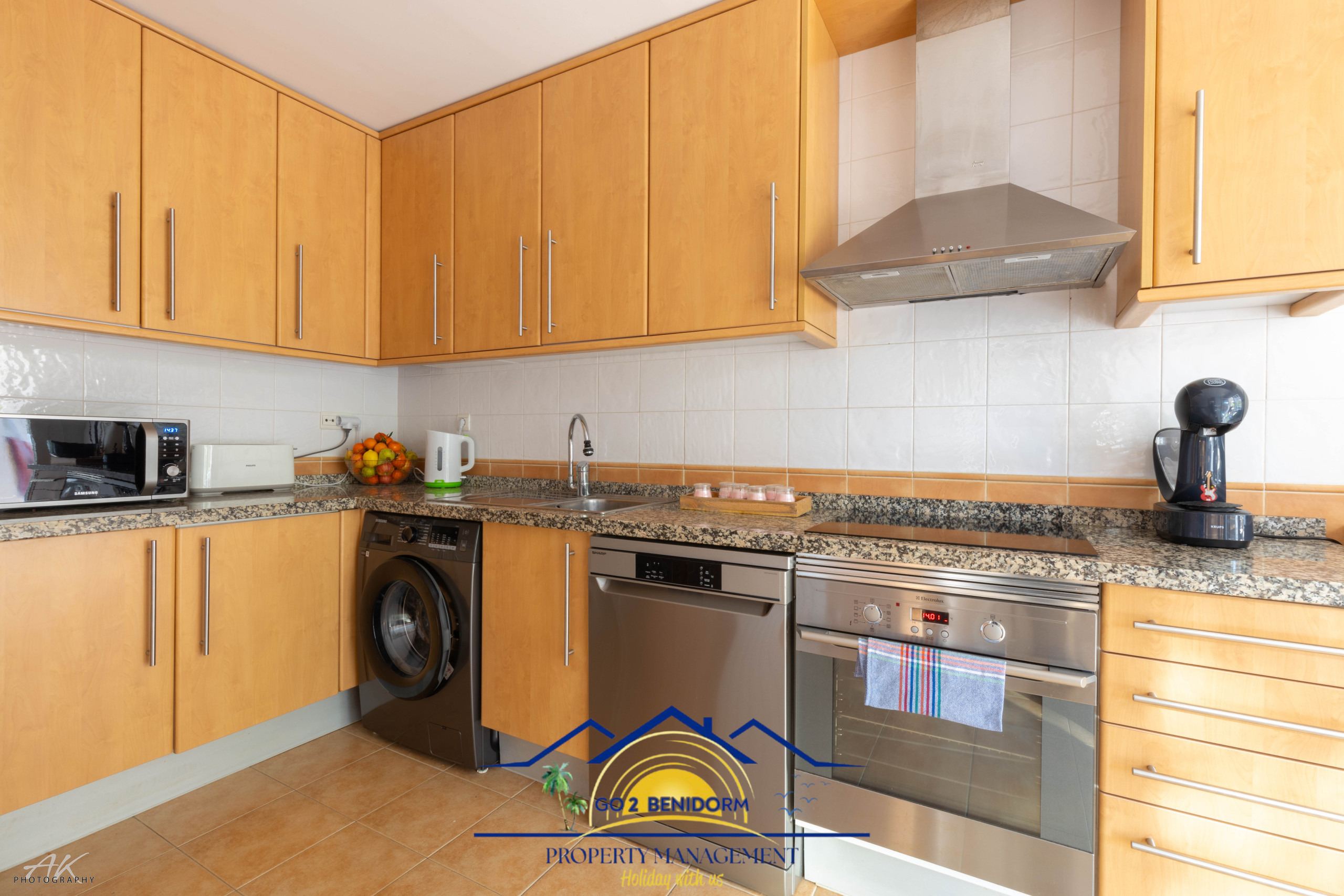 La cuisine, est équipée avec réfrigérateur, micro-ondes, four, congélateur, lave-vaisselle, vaisselle/couverts, ustensiles/cuisine, cafetière, grille pain et bouilloire.