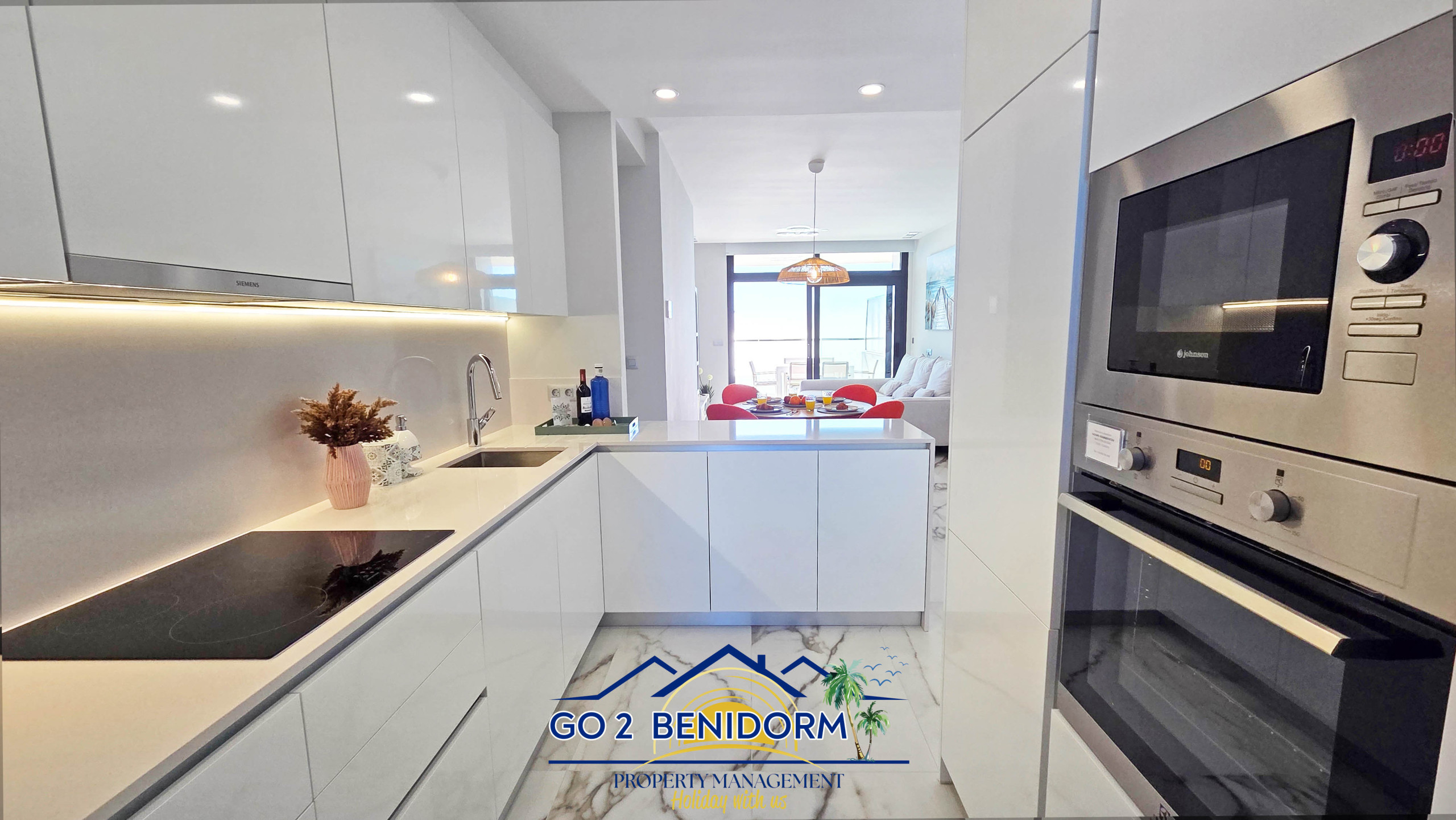 One of the apartment’s most special features is the panoramic dining area, offering breathtaking views of Benidorm’s skyline and the endless sea. Whether you’re enjoying a morning coffee or a glass of wine at sunset, the view will always enchant you.